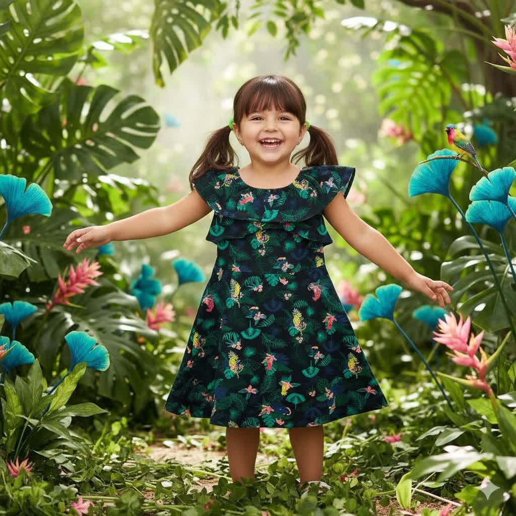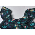 یقه قایقی دلبرونه در طراحی این پیراهن دخترانه کیابی، جلوهای ظریف و کودکانه ایجاد میکند. قسمت پیش سینه دارای جزئیات جذبه است و از زیر سینه به صورت دامن کلوش چینچینی باز میشود. این طراحی، تنخور بسیار خوشفرم و جذابی به لباس میدهد و باعث میشود کودک در آن احساس راحتی و آزادی حرکت داشته باشد.