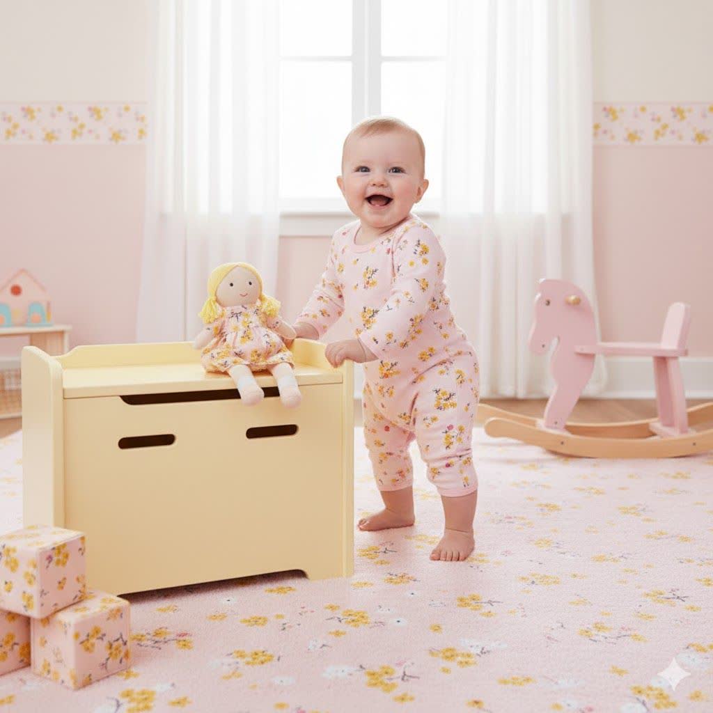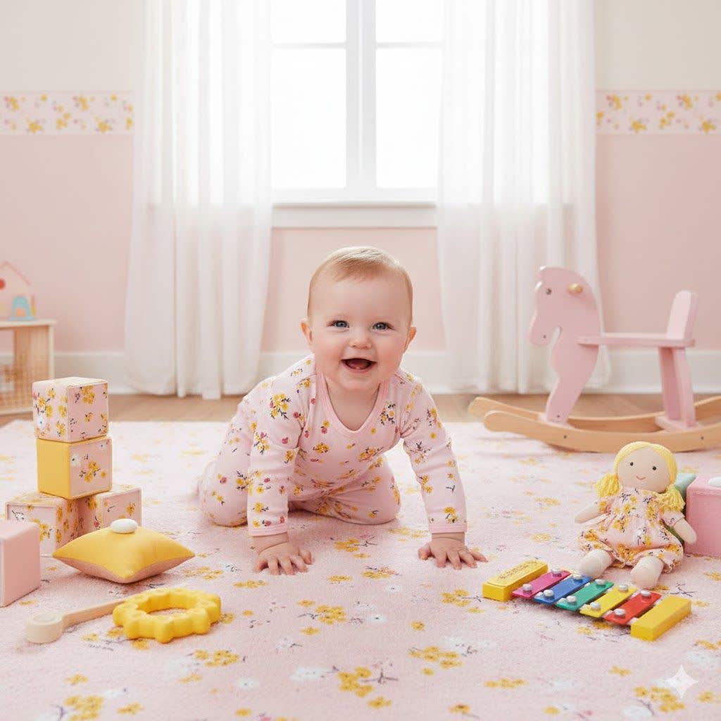 سرهمی نوزادی دخترانه صورتی تن یک دختر ۱۱ ماهه در اتاق بازی، ست شده با وسایل صورتی و اسباب‌بازی‌های کودکانه