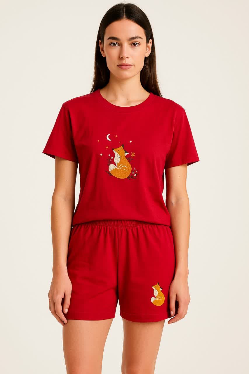 ست تیشرت و شلوارک زنانه طرح روباه مناسب سایز38-44 یکی از بهترین انتخابها برای بانوانی است که به راحتی، لطافت و طراحی خاص اهمیت میدهند. این ست شامل یک تیشرت آستین کوتاه با چاپ روباه فانتزی در قسمت جلو و یک شلوارک همرنگ و هماهنگ است که جلوهای خاص به استایل خانگی شما میبخشد.